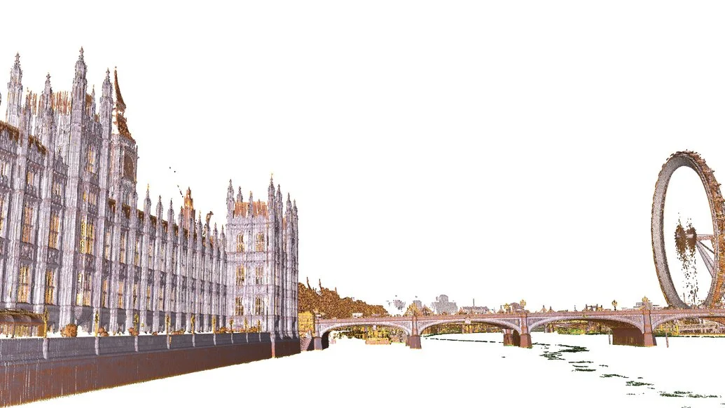 左側為西敏宮(英國國會大廈),右側為倫敦之眼,兩張影像皆由VZ-600i在移動狀態下在船上拍攝。點雲顏色根據反射率屬性進行著色。