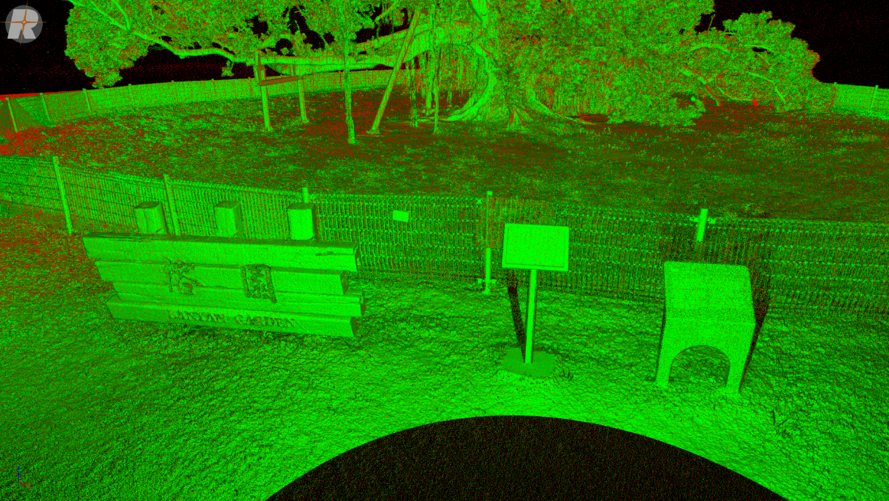 對採集效率而言,動態模式僅耗時7分鐘完成超過430公尺的移動軌跡,掃描範圍更是涵蓋了整座榕園;在點雲細節上,動態掃描精準地貼合在靜態掃描的基準之上,