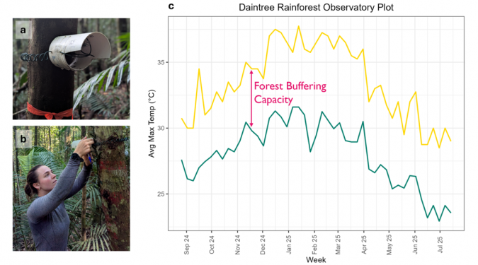 圖4:a) 以輻射遮蓋保護的EL-USB-2 Lascar感測器;b) Luna Soenens安裝感測器的情景;c) 根據一年內Daintree Rainforest Observatory樣區內外測量資料,顯示熱帶雨林的緩衝能力。